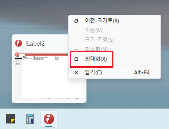 3. 나타나는 작은 미리보기 창을 우클릭하여 메뉴를 열고 ‘최대화’를 선택합니다.